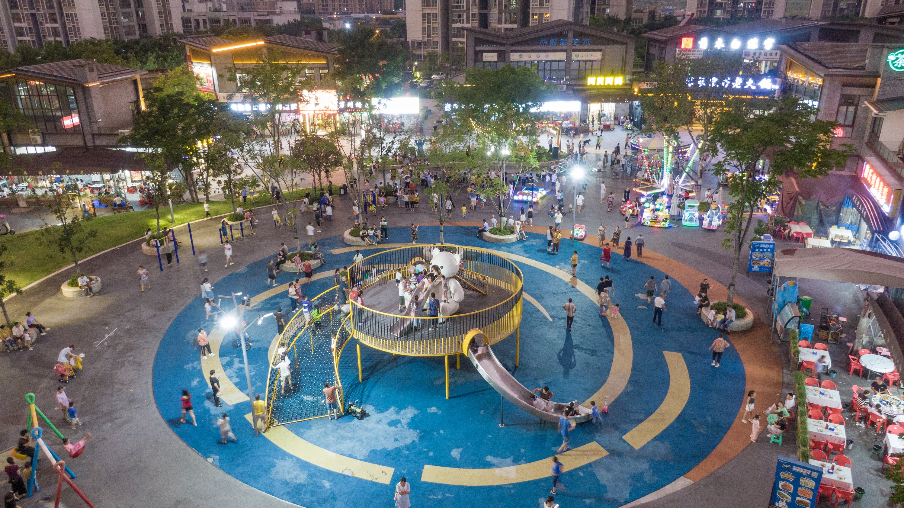 “國盛不夜城”是開放式街區(qū)、超大體驗空間、兒童主題公園和景觀亮化工程?,F(xiàn)已經(jīng)形成一個融合特色餐飲、休閑娛樂、文化體驗為一體的的公園主題美食不夜街區(qū)。