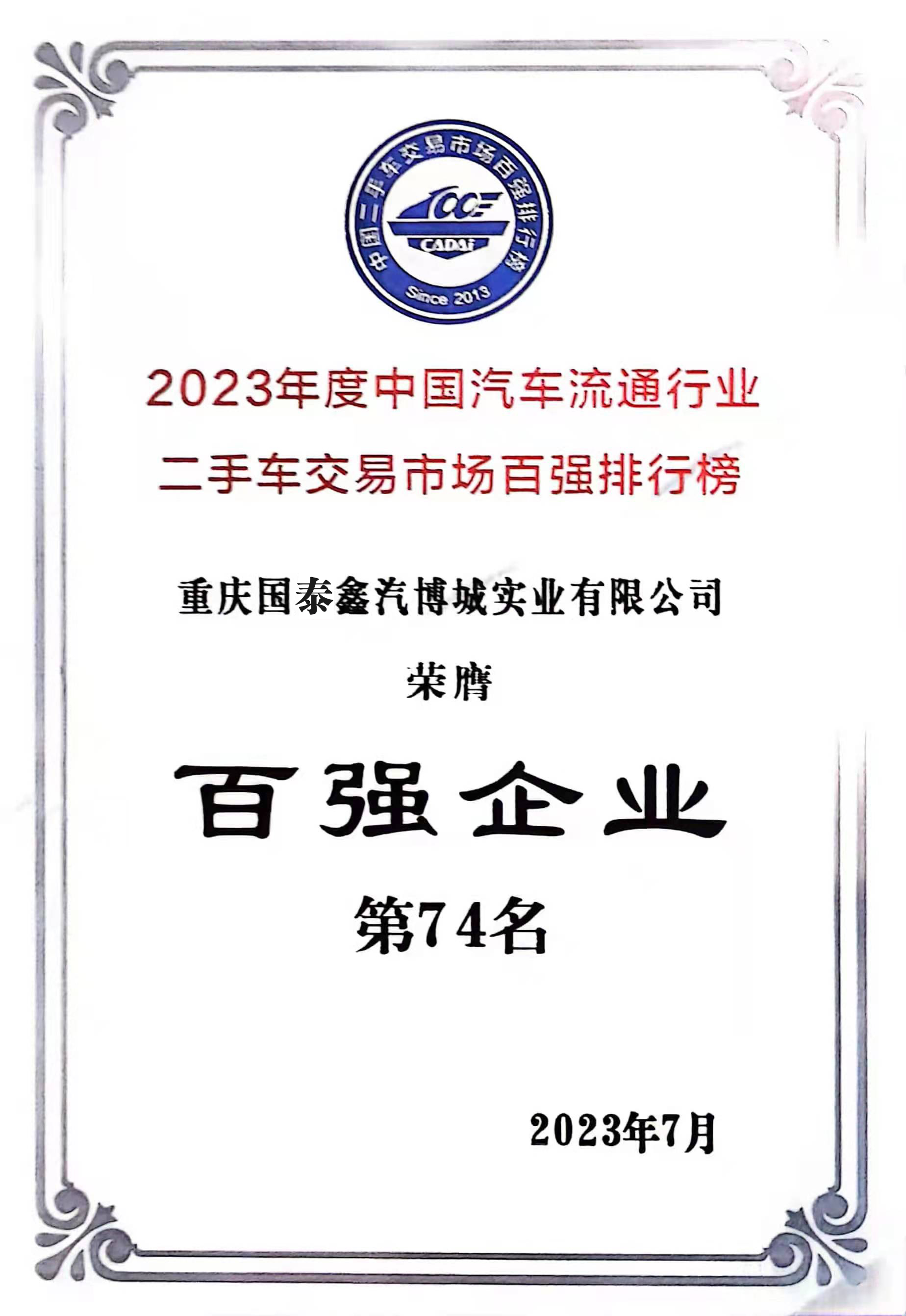大會(huì)還發(fā)布了2023年中國二手車百強(qiáng)排行榜榜單,重慶國泰鑫汽博城榮登百強(qiáng)排行榜第74位。