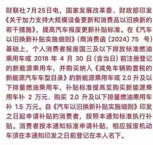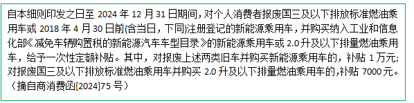 今年5月,《商務(wù)部 財政部等7部門關(guān)于印發(fā)<汽車以舊換新補貼實施細(xì)則>的通知》(商消費函[2024]75號),就報廢車并購買新能源乘用車,實施補貼。